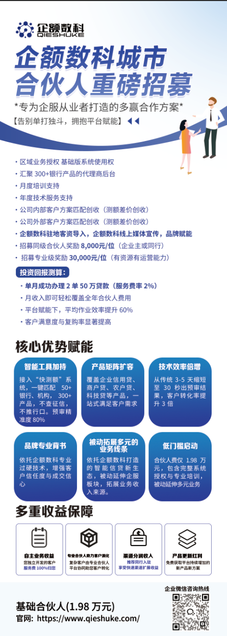 企额数科,正式开放“城市合作伙伴”计划。我们把复杂的金融技术变成简单的赚钱工具,你无需是行业专家,就能开启一份前景无限的轻资产事业!