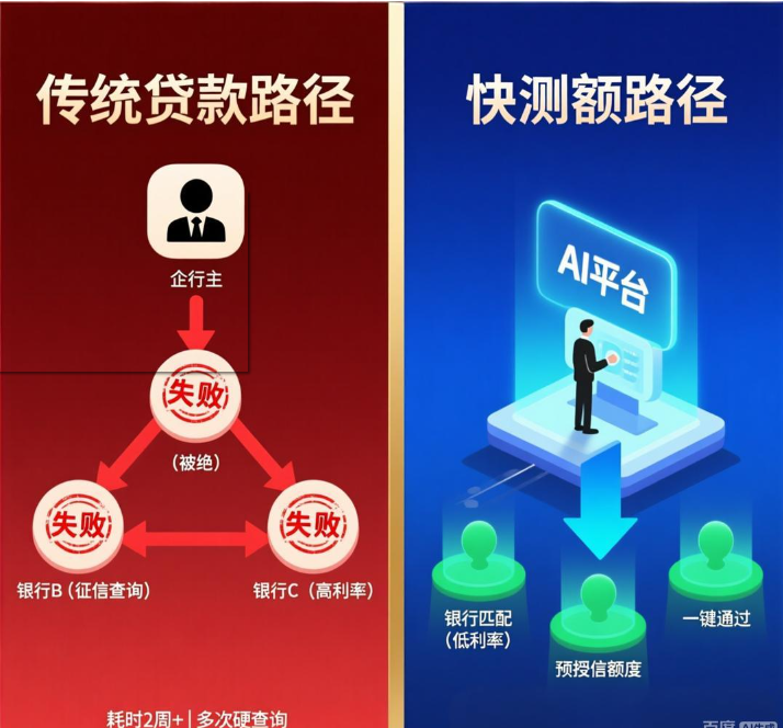 (2)财务不规范之困:约60%的中小制造企业存在"双账并行"问题,现金流数据失真率超45%。银行尽调平均耗时7天,常导致企业错失融资窗口期。"快测额"通过AI模型快速评估,避免了传统尽调的繁琐流程。