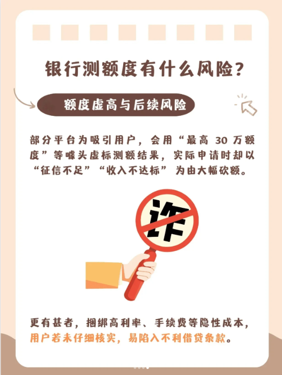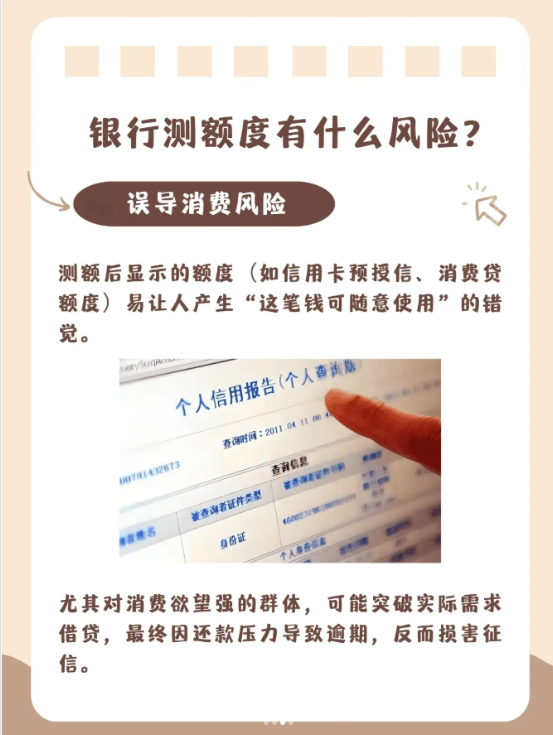 1、 误导消费风险:测试额度后显示的额度易让人产生 “可用资金充足” 的错觉,刺激非理性借贷,尤其对自制力弱的人,可能引发过度负债。
