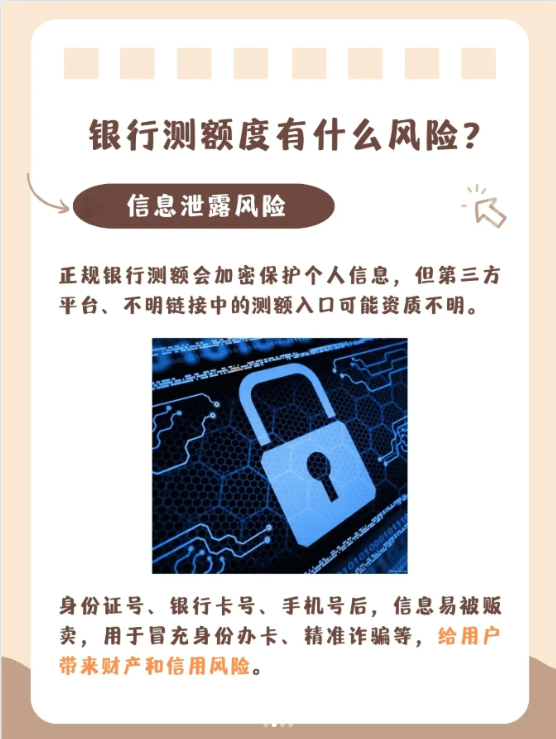 4、 信息泄露风险:非银行官方渠道测额可能要求填身份证、银行卡等信息,资质不明的平台易泄露信息,用于诈骗、非法借贷等。